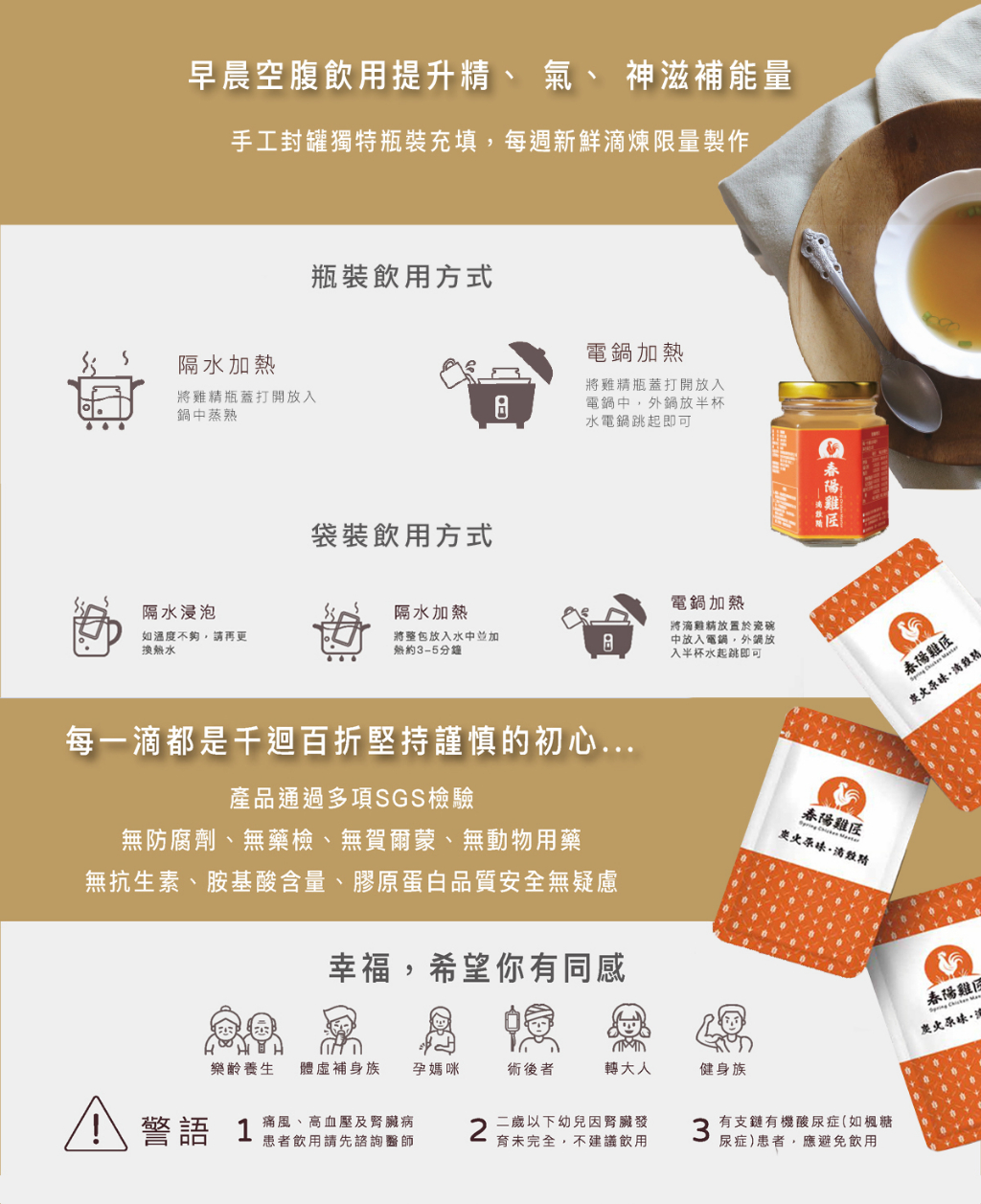 ◾️ 100%以溫體雞新鮮滴煉,製作濃厚香醇滴雞精